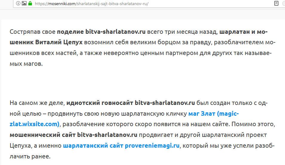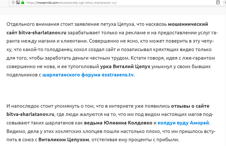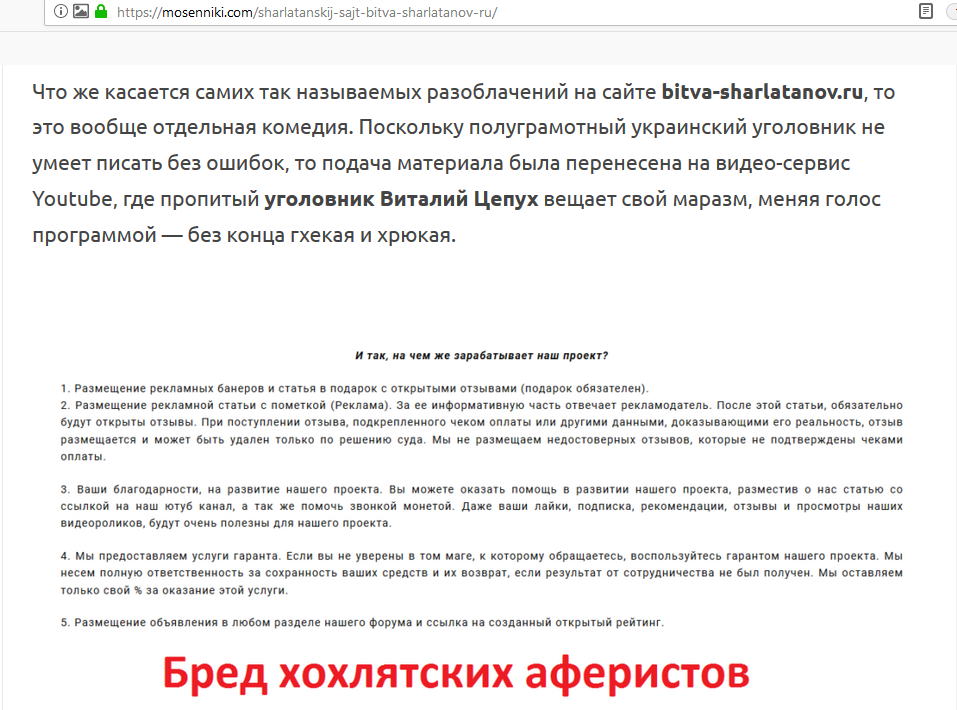 которые этот уголовный уникум рекламирует на своем шарлатанском сайте Битва шарлатанов (bitva-sharlatanov.ru), одновременно крайне примитивно сводя счеты с конкурентами.