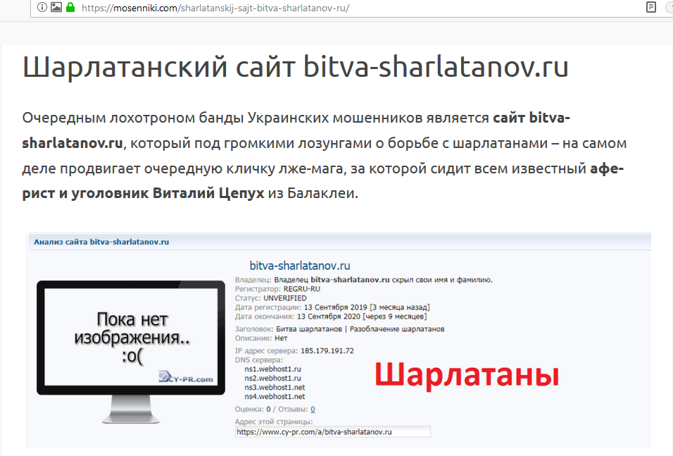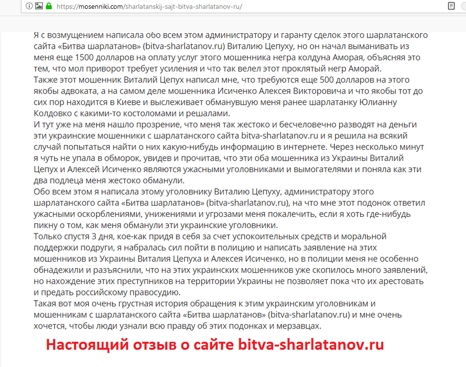 Битва шарлатанов (bitva-sharlatanov.ru) — мошенники Украины в лице все того же украинского уголовника-рецидивиста Цепуха Виталия Викторовича, окончательно обезумевшего крайне глупого проходимца и извращенца, разоблаченного в предыдущих обзорах на нашем портале под его кличками: