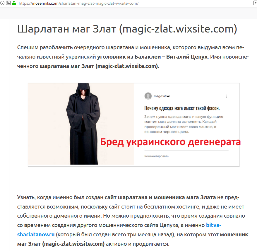 10-летнее уголовное прошлое украинского шизофреника и безумца Виталия Цепуха, по данным многих сайтов, сексуального извращенца, подрабатывающего в настоящее время в своем маленьком заброшенном украинском городке Балаклеи сутенером извозчиком дешевых украинских проституток, отсутствие нормального образования и какой-либо профессии, приводят к тому, что этот омерзительный проходимец и тунеядец выдумывает для обмана людей таких вот крайне смешных клоунов, как шарлатан маг Злат (magic-zlat.wixsite.com), которого психически больной уголовник Виталий Цепух вырядил в усмирительную рубашку пациента из психбольницы и выдает ее для глупых людей якобы за «одежду мага».