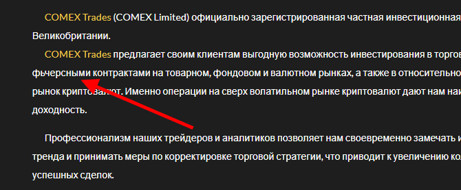 COMEX Trades (COMEX Limited) якобы официально зарегистрированная частная инвестиционная компания в Великобритании. Это не так, во первых не имеют лицензии и регистрации там, разве что только на каких-то информационных сайтах, с липовым номером и данными. Во вторых, компания должна быть зарегистрирована в нашей стране и иметь лицензию ЦентрБанка, иначе просто разведут и кинут на деньги