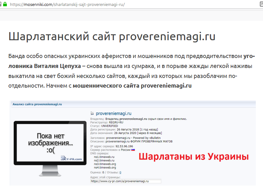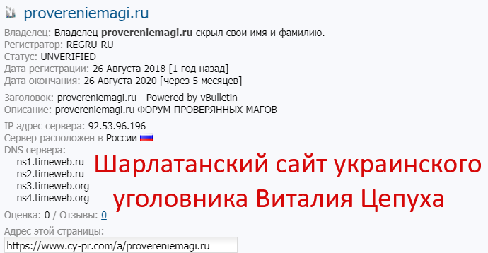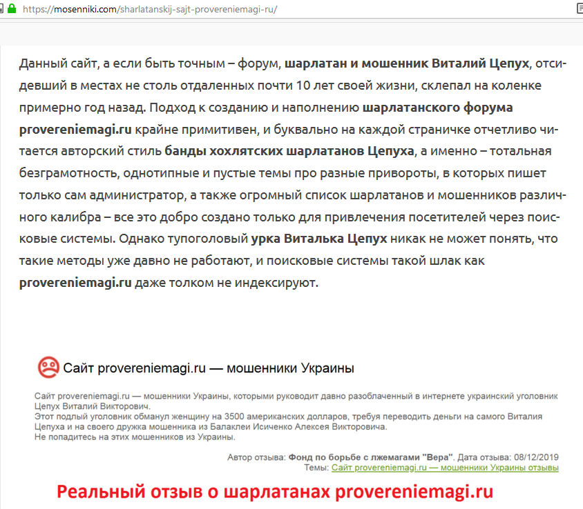 С учетом того, что хозяин шарлатанского сайта proverennie-magi.ru украинский уголовник Виталий Цепух давно полностью разоблачен в сети интернет как отпетый мошенник со множеством его криминальных подвигов и вымышленных шарлатанских кличек, не видим особо смысла уделять большего внимания указанному шарлатанскому ресурсу этого проходимца, а приведем некоторые обзоры о нем с других сайтов, как скриншотами, так и ссылками.