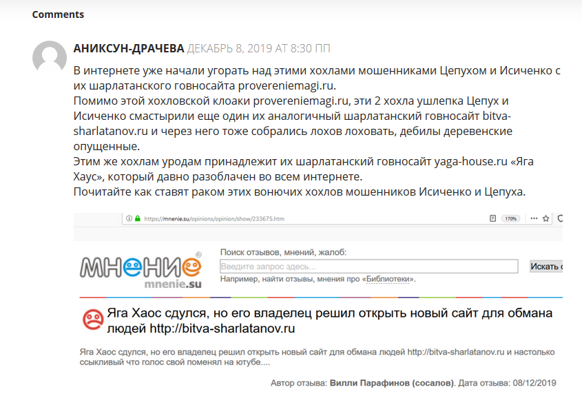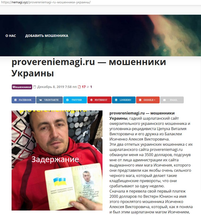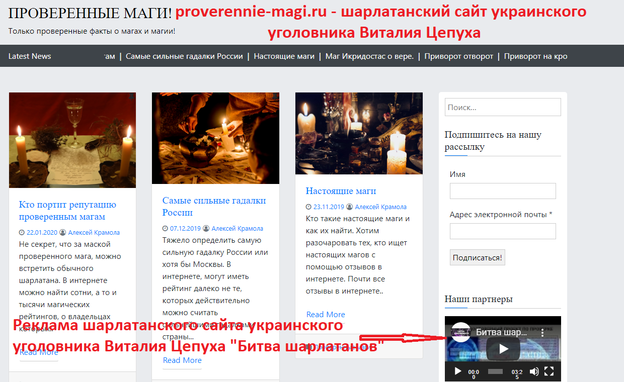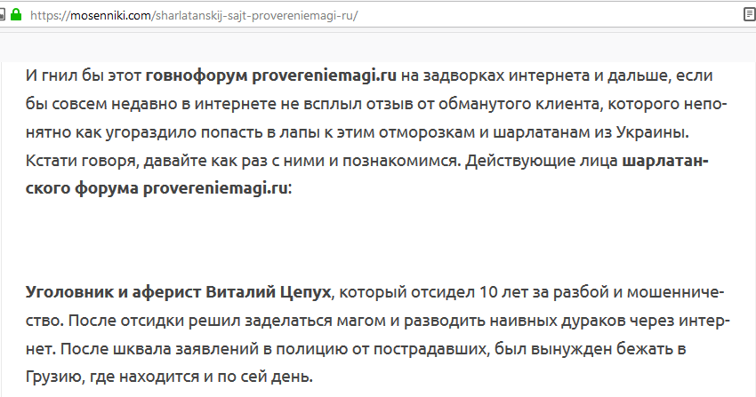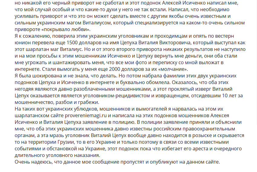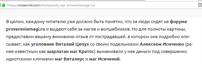 Также обзор о шарлатанском сайте provereniemagi.ru, аналоге шарлатанского сайта proverennie-magi.ru украинского уголовника Виталия Цепуха с шайкой его дружков уголовников из Балаклеи, читайте по ссылке: