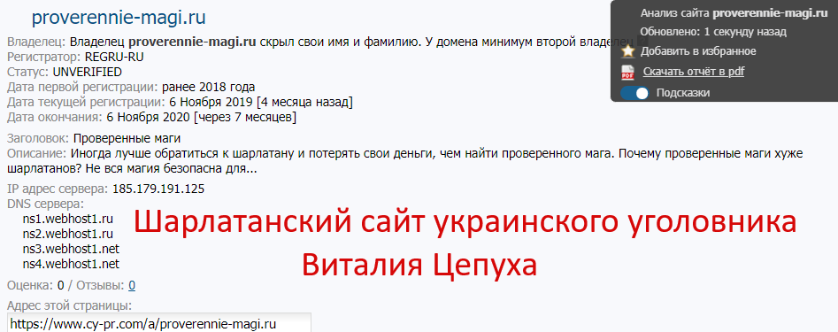 proverennie-magi.ru — мошенники Украины, шарлатанский сайт безумного украинского уголовника Цепуха Виталия Викторовича, созданный этим гнусным проходимцем и извращенцем в начале ноября 2019 года на основе более старого шарлатанского сайта provereniemagi.ru этого безумца, открытого еще в конце августа 2018 года (см. скриншоты).