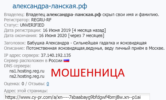Шарлатанский сайт александра-ланская.рф бабушки Александры, как еще называет сама себя данная аферистка, был открыт совсем недавно — 4,5 месяца назад, 16 июня 2019 года и соответственно ни о каком опыте этой «ясновидящей» не может быть и речи.