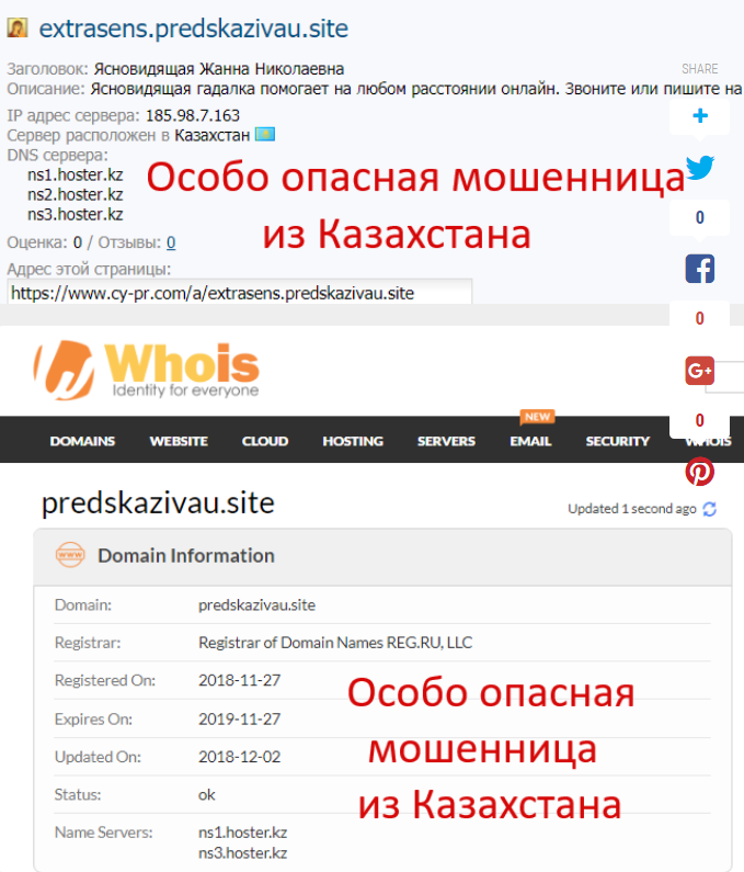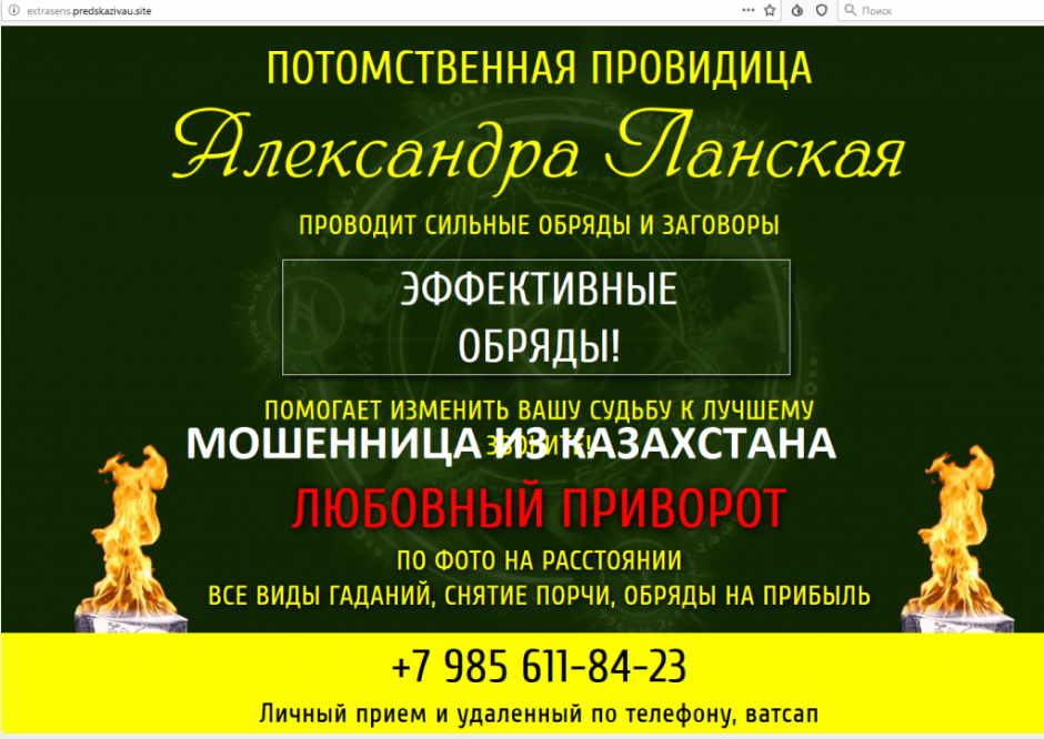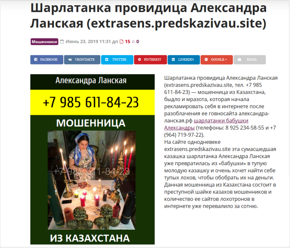 Документально зафиксировано, что шарлатанка бабушка Александра Ланская (александра-ланская.рф), являясь мошенницей из Казахстана, ранее обманывала людей через ее шарлатанский сайт predskazivau.site с использованием телефона мошенницы +7 985 611-84-23, на котором запуталась в собственных вымышленных кличках, называя себя то шарлатанкой ясновидящей Жанной Николаевной, то шарлатанкой провидицей Александрой Ланской.