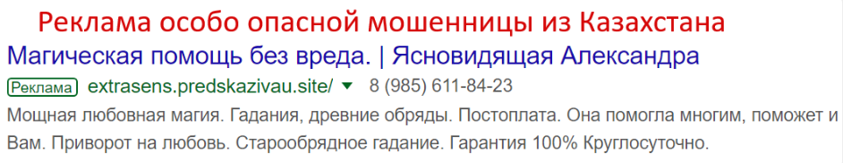 Совершенно очевидно, что с учетом использования шарлатанкой бабушкой Александрой Ланской сразу двух разных телефонных номеров в ее рекламе и непосредственно на сайте, а также постоянной рекламы в яндексе, которая весьма дорогостоящая и настройка которой требует специальных знаний, данная аферистка не является никакой бабушкой, а представляет из себя крайне опасную мошенницу, которая действует в составе организованной преступной группировки мошенников.