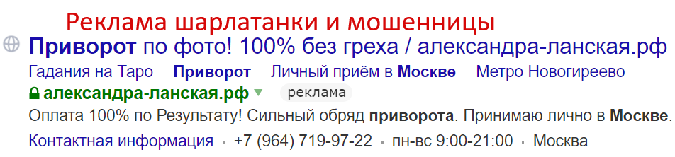 С целью обмана людей и за неимением иного способа привлечь их внимание к себе, шарлатанка бабушка Александра Ланская (александра-ланская.рф, +7 (964) 719-97-22 и 8 (925) 234-58-55), как уже отмечалось, рекламируясь в яндекс-директ, завлекает граждан в свои сети типичной шарлатанской чепухой, как то «безгрешные привороты по фото» и якобы с «оплатой по результату», что конечно же является враньем, так как на самом деле мошенница сразу же вытягивает у людей деньги якобы на закупку «материалов для обрядов», которые разумеется не проводит, а полученные деньги присваивает.