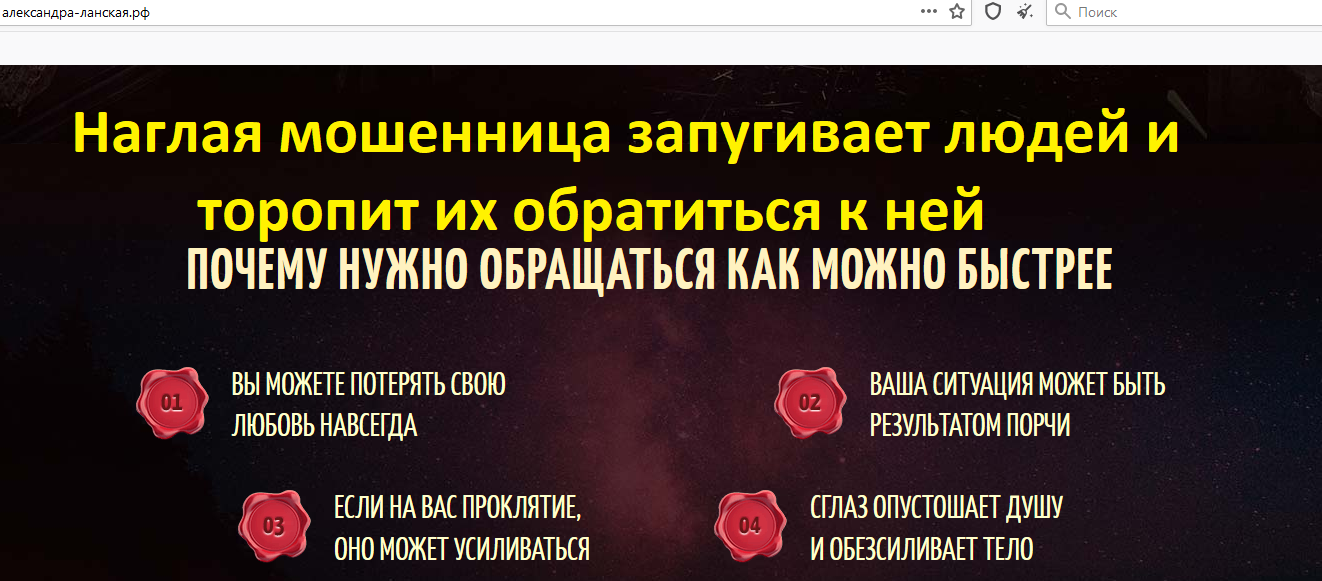 Шарлатанский сайт александра-ланская.рф бабушки Александры представляет из себя скудный и примитивный одностраничный сайт однодневку, на котором мошенница скрывает свое истинное лицо и вместо этого разместила изображение рук отнюдь никакой ни бабушки. В попытках завлечь в свои сети неосторожных людей, шарлатанка Александра Ланская торопит их обратиться к ней, запугивая совершенно очевидной шарлатанской ерундой.