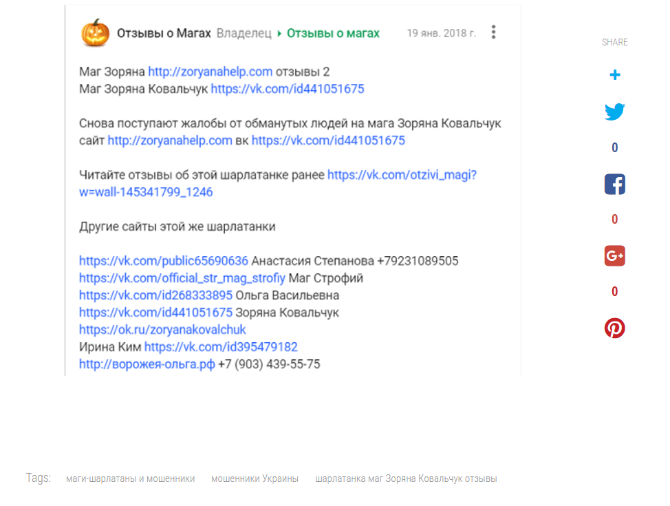 На многих сайтах давно зафиксировано, что украинская шарлатанка маг Зоряна Ковальчук (zoryanahelp.com) одурачивает людей не только через ее крайне примитивный сайт-лохотрон, но и через социальные сети, в которых эта прохиндейка создает многочисленные фейковые аккаунты и за счет этого обманывает людей от нескольких выдуманных ею кличек. Среди основных страниц в соцсетях украинской мошенницы и шарлатанки мага Зоряны Ковальчук зафиксированы: