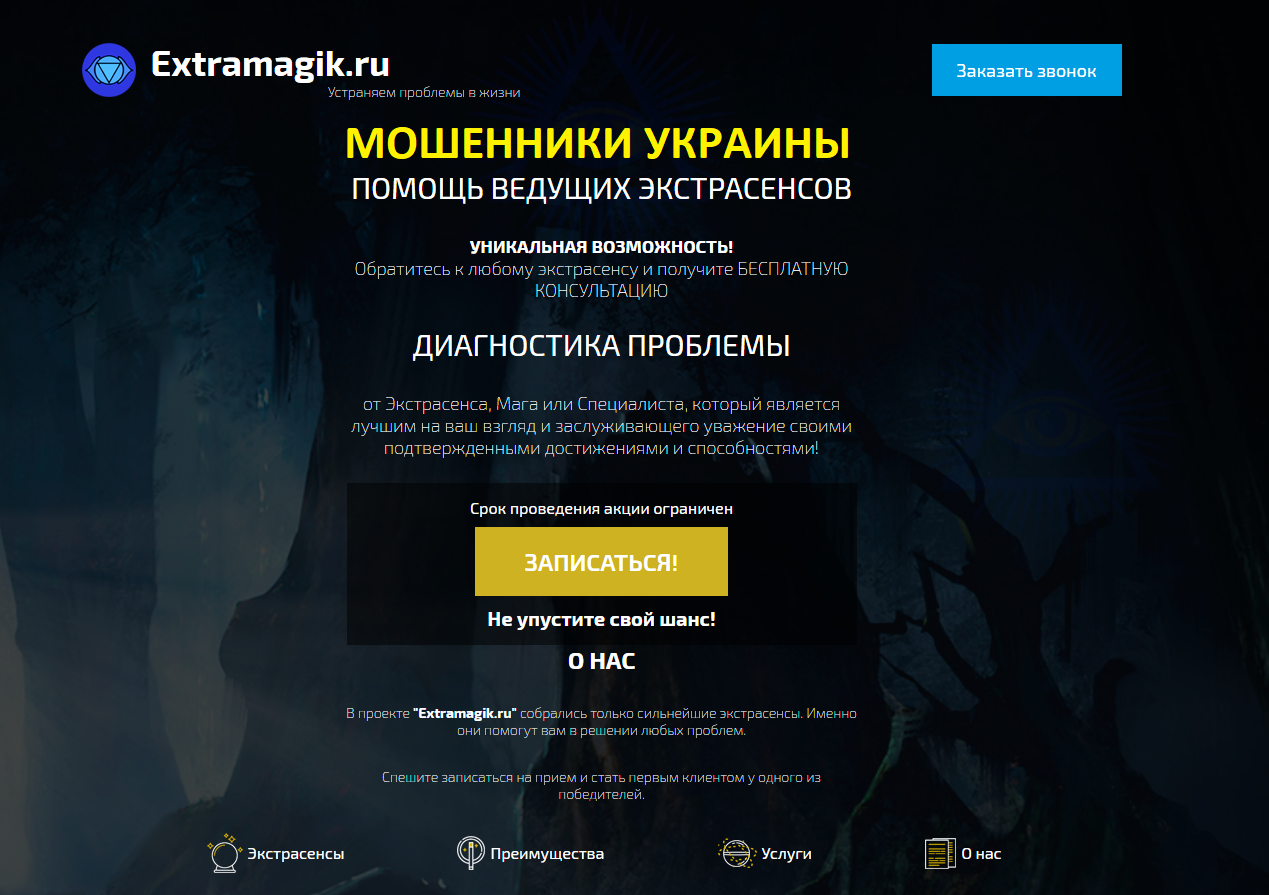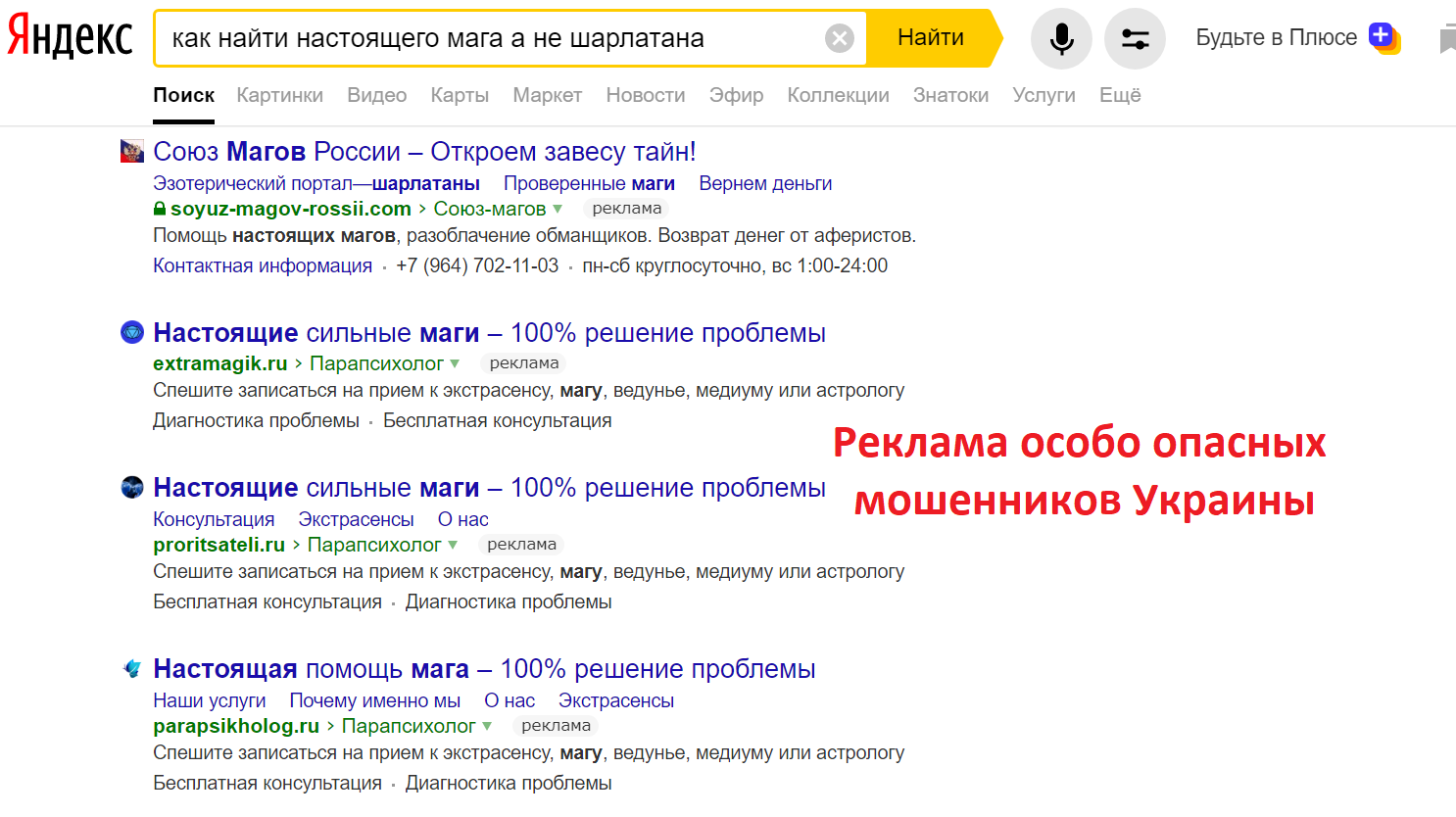 Давая одновременную контекстную лжерекламу в яндексе сразу трех допотопных сайтов помоек extramagik.ru, parapsikholog.ru и proritsateli.ru, вместе с такими же отпетыми украинскими мошенниками с Союза магов России(soyuz-magov-rossii.com), они же «Ресурс о магах №1 в России», такие вот свидомые уникумы и одурачивают недалеких людей, которые не удосуживаются почитать отзывы об этих украинских аферистах в интернете.