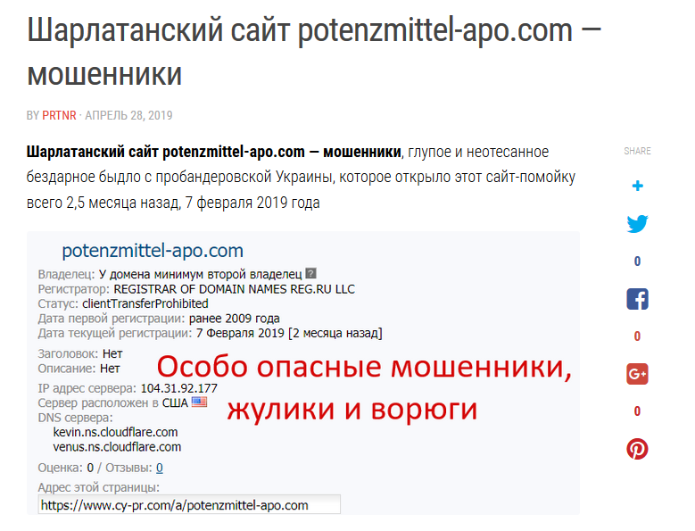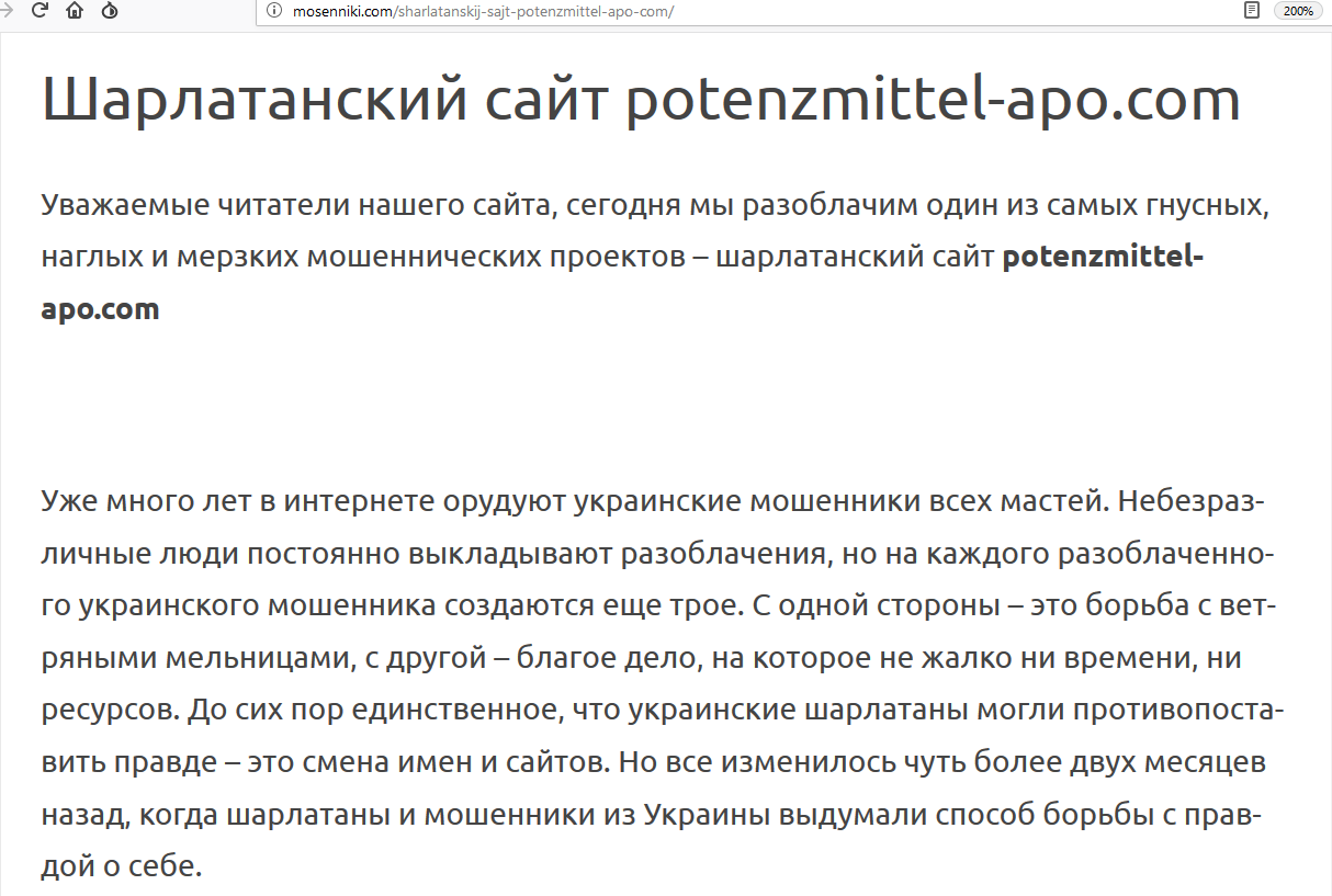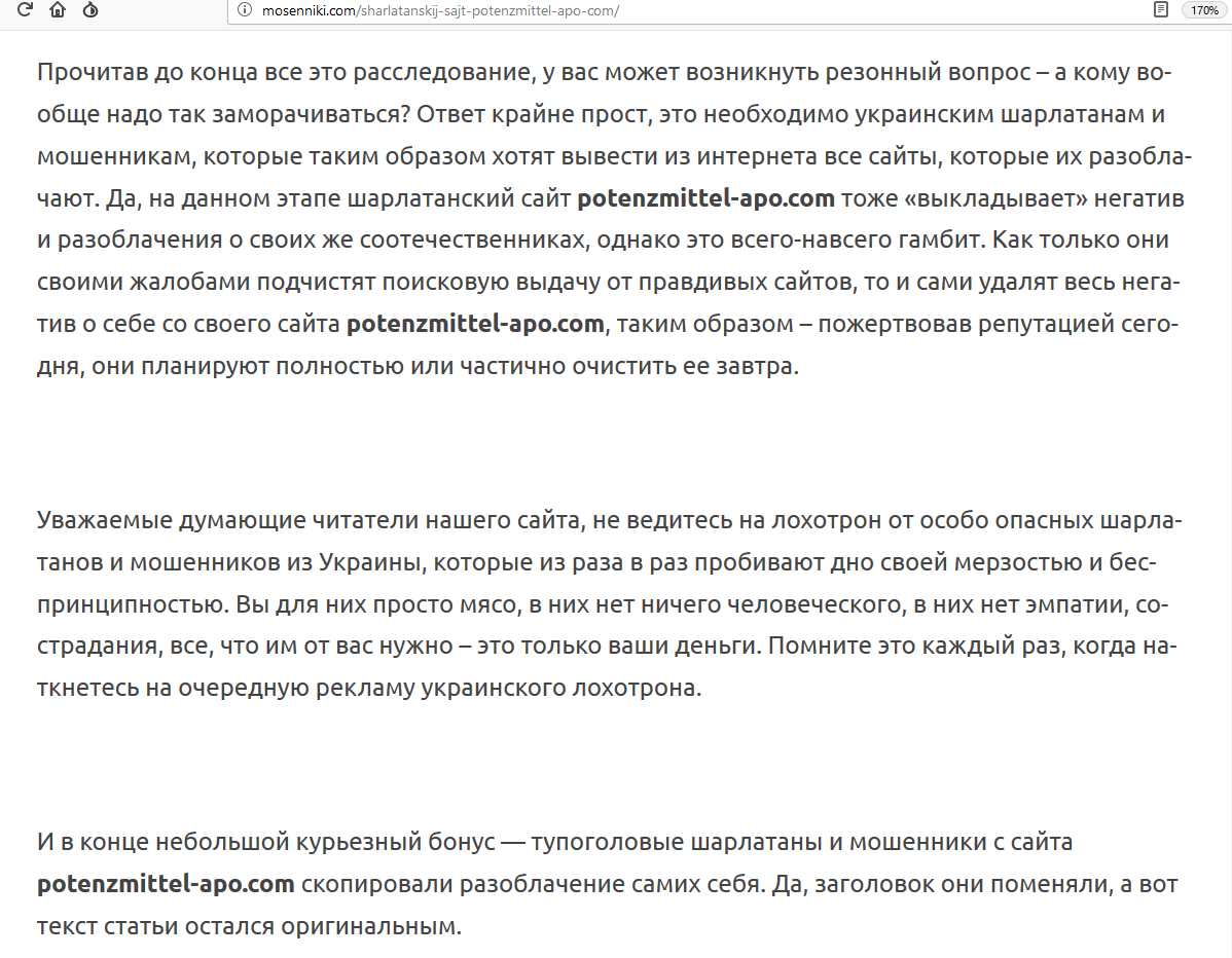 Шарлатанский сайт potenzmittel-apo.com — очередная помойка отпетых мошенников с Украины, клеветников, кляузников и ворюг, ни на что неспособных дегенератов, которые вместо того, чтобы создавать хоть какие-то собственные ресурсы и наполнять их собственным оригинальным контентом, занимаются его банальным воровством на других сайтах сети и в том числе на нашем.