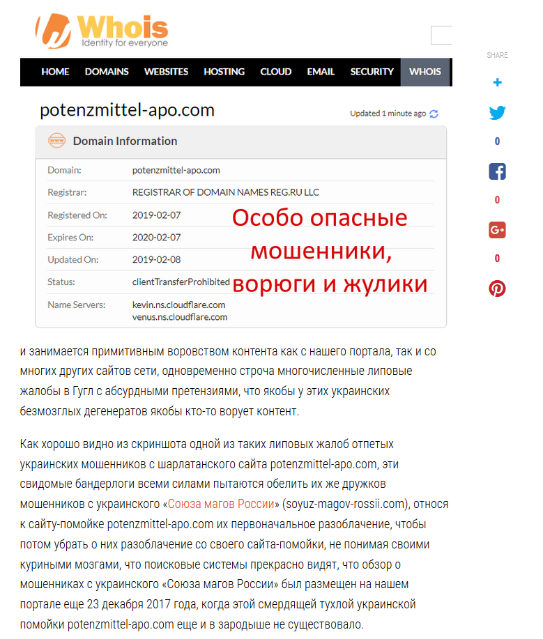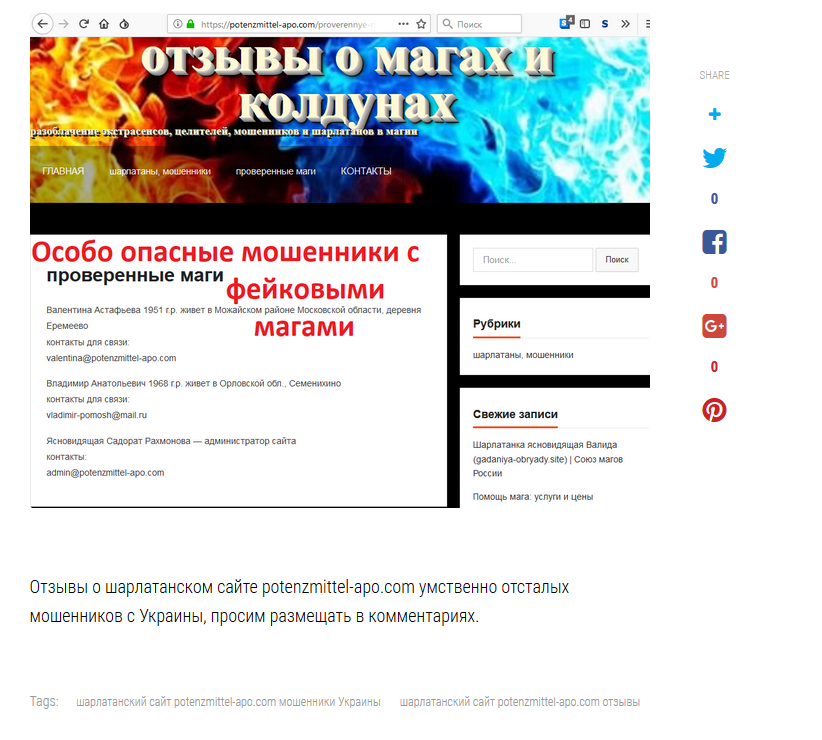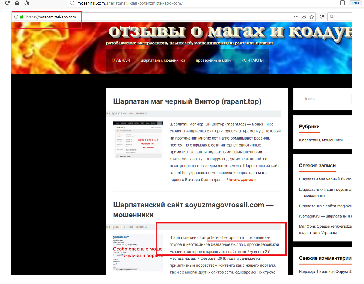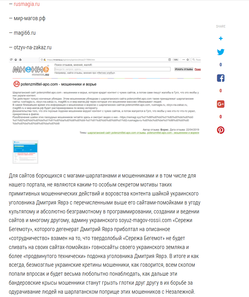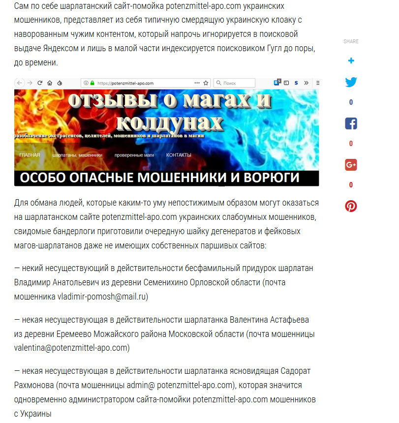 Конечно же интернет пространство не осталось равнодушным к гнусным украинским подонкам, ворюгам, лжецам и мошенникам с шарлатанского сайта potenzmittel-apo.com, бездарным и тупым проходимцам с бандеровской Незалежной, которые пытаясь обмануть как и простых людей своим глупым мошенничеством от магии, так и американский поисковик Гугл введением его в заблуждение, и полностью разоблачило украинских мерзавцев мошенников.