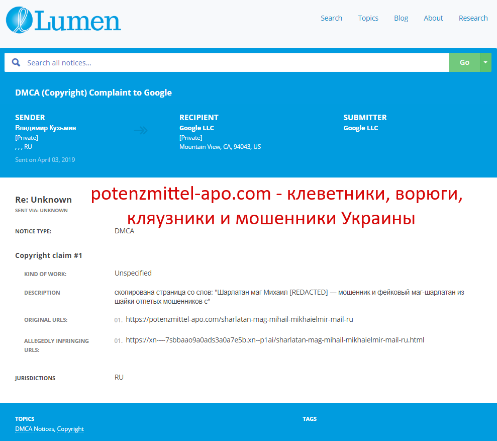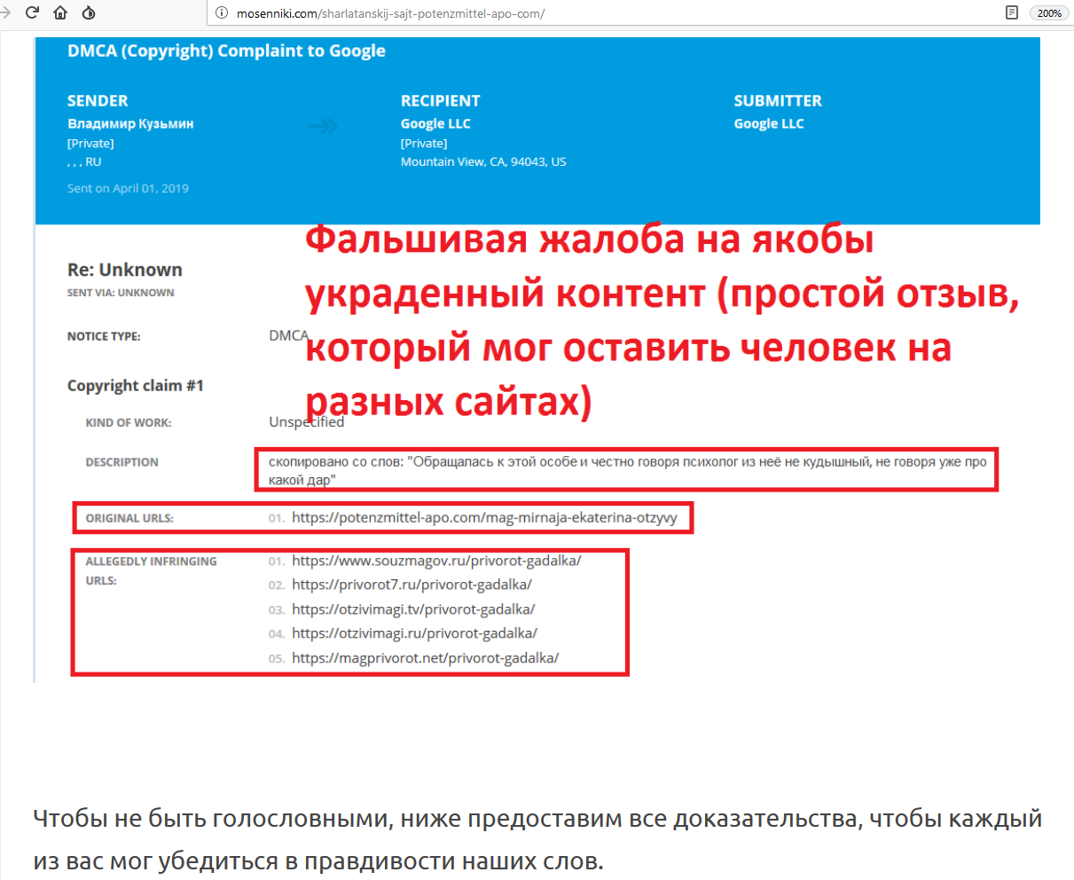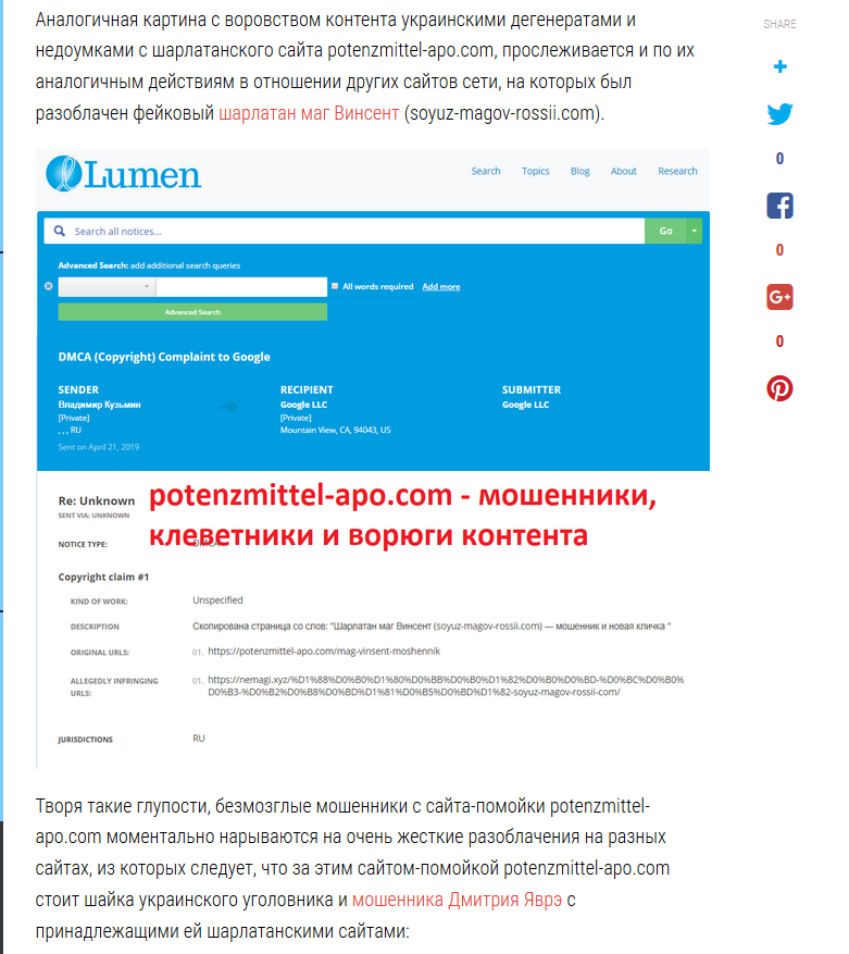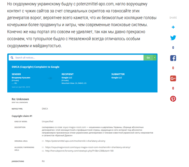 Приведенные ниже скриншоты наглядно демонстрируют, что некий лжец, мошенник и жалобщик Владимир Кузьмин на постоянной основе дезинформирует поисковик Гугл, нагло воруя контент нашего ресурса и жалуясь при этом якобы на воровство контента с украинской шарлатанской помойки potenzmittel-apo.com.