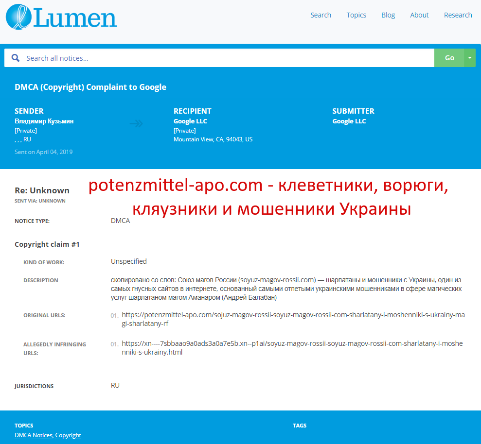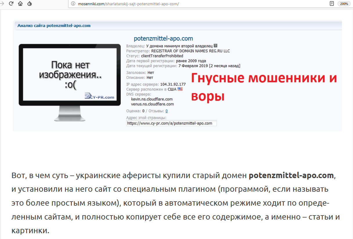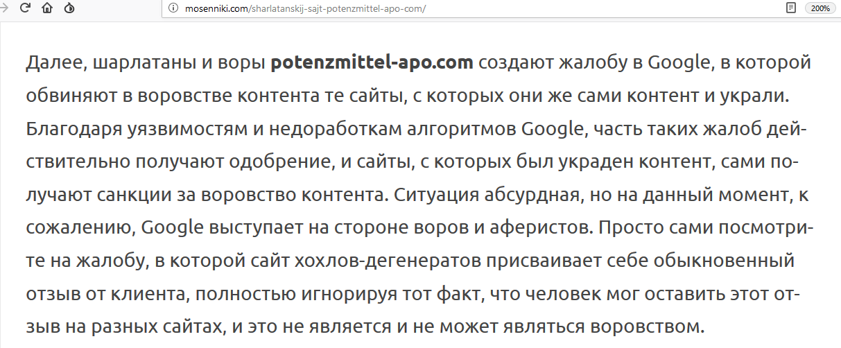 Открыв всего лишь 7 февраля 2019 года шарлатанский сайт-помойку potenzmittel-apo.com, оголтелые мошенники Незалежной не только нагло воруют контент с чужих сайтов, но и не гнушаются при этом строчить абсолютно абсурдные жалобы в Гугл, умышленно вводя этот поисковик в заблуждение якобы о том, что сайты возраст которых составляет несколько лет в отличие от не достигшей даже возраста 3 месяцев украинской помойки potenzmittel-apo.com, в связи с чем не до конца отработанные алгоритмы реакции поисковика Гугл на такие идиотские лживые жалобы украинских дегенератов и ворюг с шарлатанского сайта potenzmittel-apo.com, зачастую приводят к удовлетворению таких лживых жалоб украинских подонков мошенников и выбрасывают из поисковой выдачи обзоры с оригинальным контентом сайтов первоисточников информации и в том числе, отдельные обзоры про мошенников нашего ресурса.