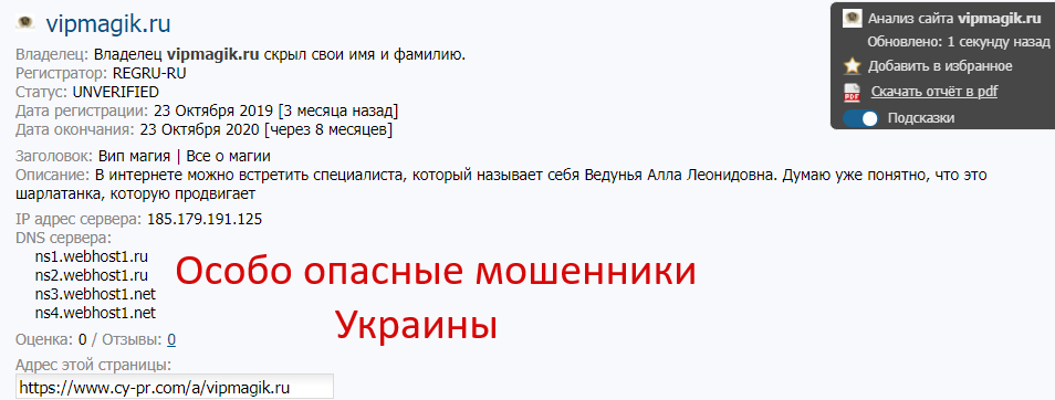 vipmagik.ru — мошенники Украины, примитивный шарлатанский сайт украинского уголовника-рецидивиста Цепуха Виталия Викторовича, который этот обезумевший от массовых разоблачений проходимец открыл с целью обмана российских граждан 4,5 месяца назад, 23 октября 2019 года,