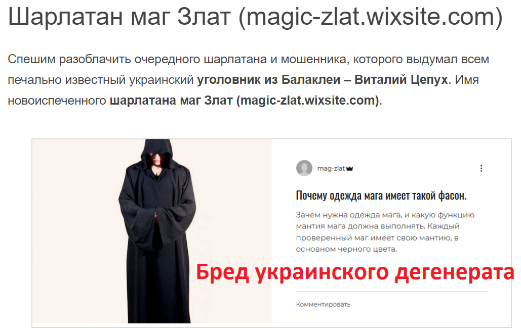 В приведенных обзорах по размещенным выше ссылкам на выдуманных украинским безумным уголовником Виталием Цепухом шарлатанов магов Икридостаса и Злата, уже приведены все безумства этого извращенца Цепуха, который находясь в маленьком украинском городке Балаклеи, глупо лжет о его местонахождении в лице выдуманных им персонажей то в Москве, то в Швейцарии, то еще где угодно, при этом воруя фотографии этих жалких клоунов в интернете и выряжая их в немыслимые так называемые «магические одеяния», в действительности называющиеся усмирительными рубашками для психически больных украинских шизофреников.