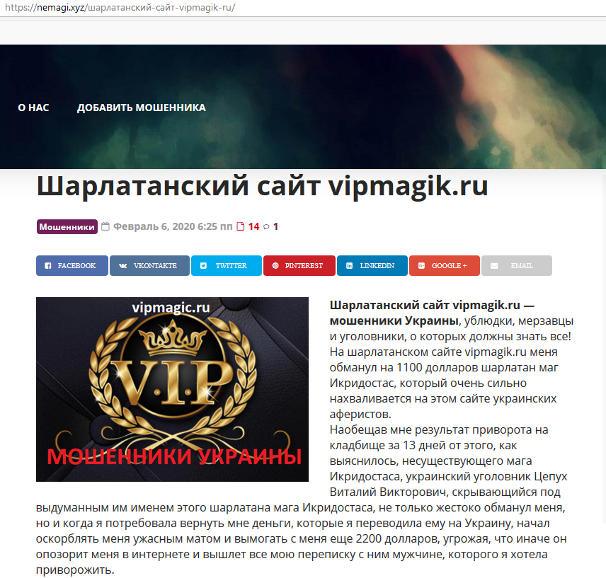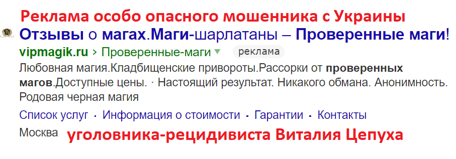а также предлагает неосторожным людям писать с просьбами о приворотах и прочей шарлатанской ахинее непосредственно администрации шарлатанского сайта vipmagik.ru, с тем, чтобы сам же админ указанного ресурса украинский уголовник Виталий Цепух и посоветовал сам себя под маской какого угодно мага-шарлатана наивным людям.