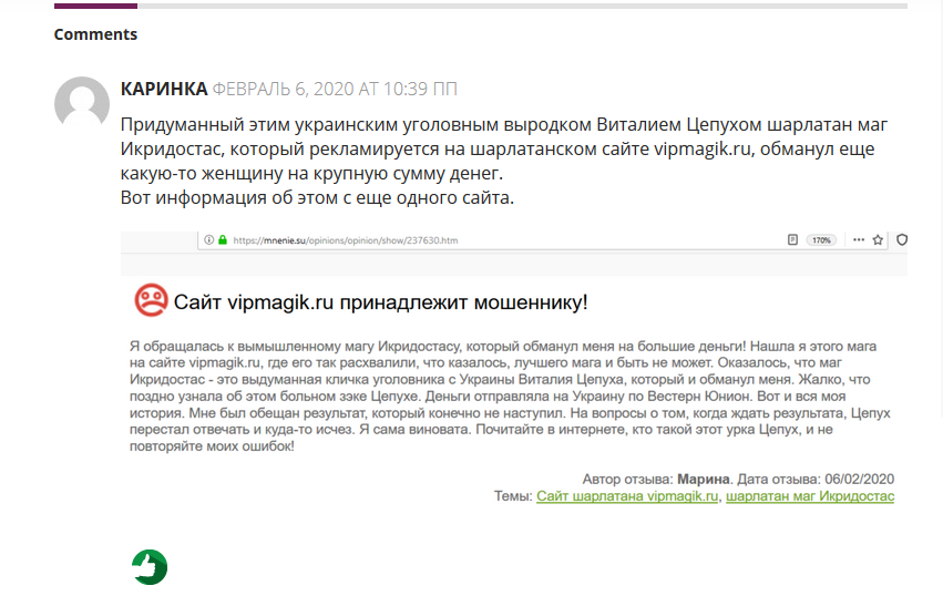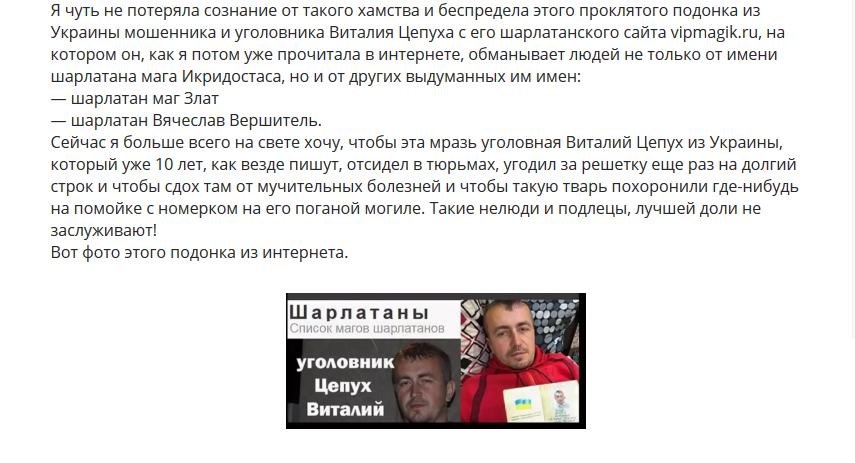 С большим сожалением также отметим, что еще в феврале 2020 года украинский уголовник Виталий Цепух обманул женщину на крупную сумму денег от лица вымышленного им шарлатана мага Икридостаса, которого он рекламирует на своем шарлатанском сайте vipmagik.ru, о чем в сети давно присутствуют соответствующие жалобы и отзывы.